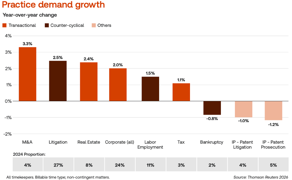 Both transactional and countercyclical practices saw significant demand growth in 2025, a relative rarity.