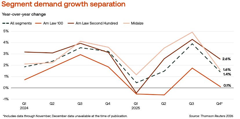 The data does show, however, a significant shift of work to relatively lower cost providers. As Thomson Reuters explains, "Midsize firms surged ahead with nearly 5% demand growth in the latter half of the year while the Am Law 100 couldn’t crack 2%, resulting in the largest percentage point-spread gap in demand between the top and bottom segments since the GFC [Great Financial Crisis]." Thomson Reuters chalks this up to the challenge GCs faced with navigating a slowing economy and the "legal chaos of the Trump administration." This forced GCs to shift not just routine matters, but also more complex work to firms with lower rates. This shifting resulted in clients spending less per hour on legal services in 2025 than in 2024, despite the average law firm’s worked rates increasing 7.3% in 2025.